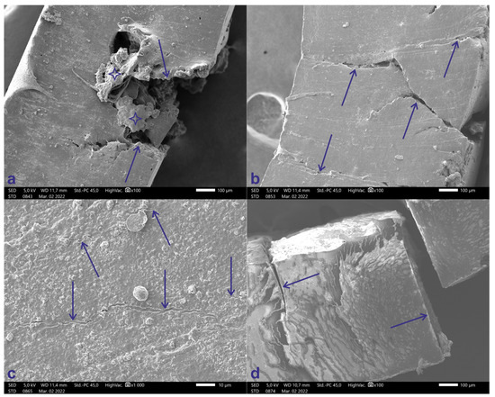 (a) SEM record of Lion ligature at 100× magnification. Arrows show the irregular shape of the crack, blue stars indicating the fluffing. (b) Red cat SEM recorded at 100× magnification. Arrows show the irregular shape of the crack. (c) Gorilla ligature SEM recorded at 1000× magnification. Only small cracks are visible on the surface (blue arrows). (d) Horse carriage ligature SEM recorded at 100× magnification. The cracks are rectilinear and perpendicular to the outer surface.