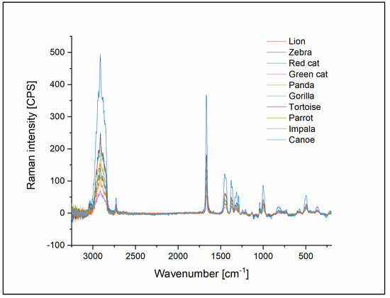 The Raman spectra of the latex ligatures showed typical vibrational features known from the literature. The most salient features were the peak at 1667 cm−1 and the peak at 2914 cm−1. The peak at 1667 cm−1 was assigned earlier [28,29,30] as a C=C stretch. The strong signal at ~2914 cm−1 is rather a combination of three poorly resolved peaks, as seen earlier [30]. The two shoulders (2881 cm−1 and 2932 cm−1) were assigned as asymmetric CH2 stretches. The central peak (2914 cm−1) was a symmetric stretch of CH3. The Raman measurements did not show differences between the latex-based samples, which is not unexpected, as, for example, the increasing silica of natural rubber was hardly observed previously [30]. The lack of additional peaks from the added materials could be a result of the low concentration used or the lack of the Raman activity of the added compound (Figure 9).