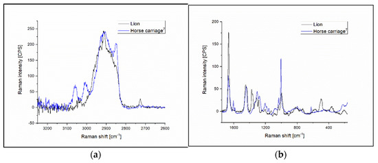 (a) Raman spectra of Lion (represents latex ligature group) and Horse carriage7 (represents latex-free ligatures) elastomers at 3250 cm−1–2600 cm−1 region. (b) Raman spectra of Lion and Horse carriage7 elastomers at the range of 1750 cm−1–165 cm−1.