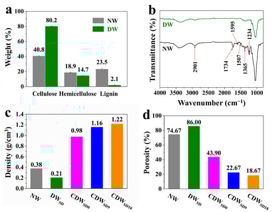 (a) The composition of cellulose, hemicellulose, and lignin in natural wood (NW) and delignified wood (DW). (b) FTIR spectra of NW and DW. (c) Density and (d) porosity of NW, delignified wood by solvent exchange drying (DWSD), compressed delignified wood by solvent exchange drying compressed under 0% moisture content (CDWSD0), 9% moisture content (CDWSD9), and 18 moisture content (CDWSD18).