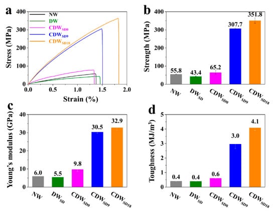 (a) Typical tensile stress–strain curves for NW, DWSD, CDWSD0, CDWSD9, and CDWSD18. The respective (b) tensile strength, (c) Young’s modulus, and (d) toughness from the tensile stress–strain curves.
