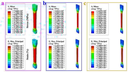 Figure 4 shows the stress distributions of CDWSD0 (Figure 4a), CDWSD9 (Figure 4b), and CDWSD18 (Figure 4c) when subjected to tension load. Meanwhile, Videos S1–S3 (Supporting Information) also present the variations of stress distributions during the loading process. The results of macro FEA indicated that the main loading was located at the middle of the sample. The CDWSD18 possessed superior tensile strength (365.5 MPa) compared to CDWSD9 (302.2 MPa) and CDWSD0 (78.4 MPa), which was also in accordance with the experimental studies.