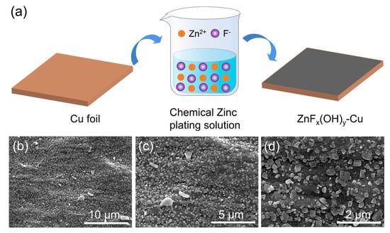 (a) Schematic diagram of the preparation of ZnFx(OH)y@Cu. Copper foil was surface-modified in ZnF2·4H2O aqueous solution. The copper foil undergoes in situ hydrolysis reaction in a chemical zinc plating solution to coat ZnFx(OH)y particles on a conventional planar Cu current collector (referred to as ZnFx(OH)y@Cu). (b–d) SEM images of the ZnFx(OH)y@Cu-modified current collectors.