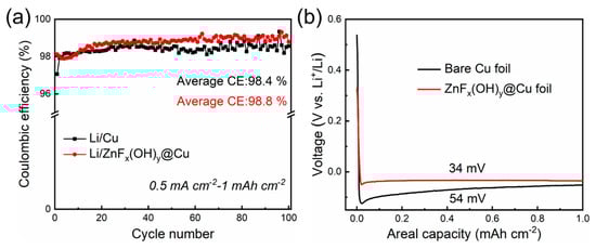 To explore the electrochemical properties of ZnFx(OH)y@Cu, Li/ZnFx(OH)y@Cu half cells were assembled. Figure 3a demonstrates Coulombic efficiencies of Li plating/stripping on Cu and ZnFx(OH)y@Cu current collectors. At a current density of 0.5 mA cm−2 and areal Li deposition capacity of 1 mAh cm−2, the first Coulombic efficiencies of the anodes based on bare Cu and ZnFx(OH)y@Cu are 97.1% and 98.5%, respectively. The lower initial Coulombic efficiency is related to the formation of a solid electrolyte interphase (SEI) layer during the first cycle. For the SEI layer on the anode of the lithium metal battery, it is generally believed that the extremely reactive metal Li reacts with the anion in the electrolyte, and the reaction products (mostly insoluble) are deposited on the surface of lithium metal, forming a passivation film thick enough to prevent electrons from passing through. The formation of the SEI layer will consume active Li in the battery, resulting in low Coulombic efficiency. During cycling, the Coulombic efficiency of bare copper began to fluctuate slightly after 60 cycles, and the average Coulombic efficiency was 98.4% over 100 cycles. The fluctuating Coulombic efficiency of Li/Cu half cells proves that the surface SEI film was continuously collapsing and regenerating, consuming a large amount of lithium, while the average Coulombic efficiency of ZnFx(OH)y@Cu can be stabilized at about 98.8% over 100 cycles, implying that nucleation sites (ZnFx(OH)y) can promote uniform nucleation/deposition of Li and form a stable SEI layer.