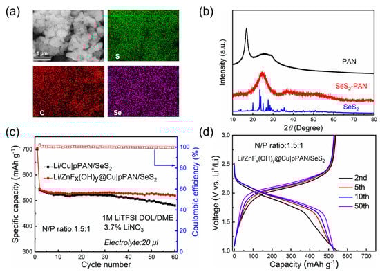 (a) SEM image and corresponding EDS element mapping (sulfur, carbon, selenium) of pPAN/SeS2 sample. (b) XRD patterns of PAN (black), pPAN/SeS2 (red), and SeS2 (blue) sample. (c) Cycling performance of Li/Cu|pPAN/SeS2 and Li/ZnFx(OH)y@Cu|pPAN/SeS2 full cell at a current density of 0.1 A g−1. (d) The discharge–charge curves of Li/ZnFx(OH)y@Cu|pPAN/SeS2 full cell at different cycles.