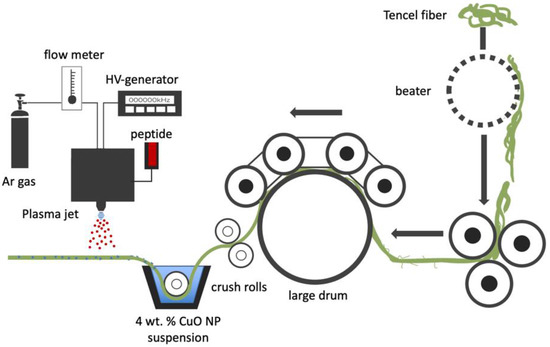A schematic illustration of the peptide coated nano-CuO/Tencel membrane fabrication is shown in Figure 1. Tencel fibers underwent a series of fiber processing from blending, carding, and needle-punching to produce a nonwoven Tencel sheet (basis weight: 100 g/m2) [61]. The nonwoven sheet was then immersed in deionized water with 4 wt.% copper oxide nanoparticle suspension, for optimal particle adhesion and an antimicrobial effect, onto Tencel fiber surface, followed by drying at room temperature for 4 h. A modified atmospheric pressure plasma jet system with a voltage of 45 kV, argon flow rate of 5 SLM, and a peptide injection flow rate of 0.05 L/min was used to coat bioactive peptide onto the nano-CuO/Tencel surface, where the tip of the plasma jet was placed 2 cm above the Tencel sheet. The peptide treatment time was set at 0, 30, 60, 90, and 120 s. The samples were kept in a desiccator up to three days before performing characterizations.