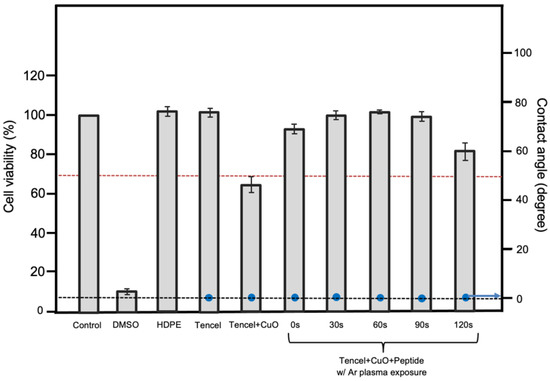 An effective wound dressing material must be non-cytotoxic to the relevant cell to maintain viability at the wound site. To reveal the cyto-compatibility of the tested membranes, the cell viability of the L929 fibroblastic cells was investigated. The L929 cell line is one of the most frequently used lines in material/cell interaction research, and has been previously used for cytotoxicity testing for many polymeric scaffolds [75,76,77]. The cytotoxicity and wettability of the prepared membranes are summarized in Figure 5. Tencel is extremely hydrophilic, and the high wetting behavior is primarily attributed to the -OH group from the cellulose-based structure (blue circles in Figure 5) [73]. Moreover, Tencel fibers pose no adverse effect on fibroblastic cells, such that the cell viability is very similar to that of the control sample. In Tencel+CuO, CuO nanoparticles appear to have a high cytotoxicity, whereas peptide-added samples appear to have little or no cytotoxic effect. Others also demonstrated a similar outcome that copper(II) complex or copper oxide nanoparticles have toxicity against L929 mouse fibroblast, A549 human lung cancer cells, or to DNA from reactive oxygen species (ROS), which enables us to comprehend apoptosis induction or an anti-proliferation effect of CuO in Tencel membranes [78,79,80]. Fibroblasts (NIH/3T3) induced with bioactive peptide show a faster gap closure rate (Figure A1A), whereas the quantitative result reveals a slower cell migration without peptide treatment (square curve) compared to peptide-treated cells (circle curve). A significant split in wound area difference is seen at 6 h, and reaches its maximum at around 13 h where the wound area is almost closed (Figure A1B). The assessment, however, was not performed on the peptide-CuO/Tencel samples because of technical limitations. The effects of the peptide-grafted Tencel samples on cell viability can be associated and explained by the degree of peptide adhesion from plasma treatment according to the IR results from Tencel+CuO+Peptide_30s-90s samples.