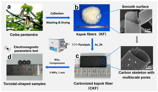 Possessing a typical hollow structure with a thin cell wall of 0.8~1.0 µm and large lumen of more than 80% porosity, KF is a bioproduct of an agricultural product from the Bombaceae family primarily grown in South Asia. Carbon microtube derived from KF has been extensively developed and utilized as an adsorbent for organic dyes, for thermal management, as sound absorption material, for catalysis, etc [13]. With natural three-dimensional tubular microstructures, the KF-derived carbon microtube may be a feasible biological candidate for the multiple scattering/reflection of penetrated electromagnetic waves [30]. Here, Kapok fibers from Ceiba Pentandra were chosen as the precursors for the fabrication of carbon microtube and investigating its microwave absorbing performance. As shown in Figure 1, the additive-free carbon microtube was prepared by directly carbonizing the kapok fibers in the argon atmosphere, with the designed experimental scheme of seven pyrolysis temperatures ranging from 500 °C to 800 °C. During the pyrolysis process, volatile constituents (such as CH4, CO2, and some organics) were removed, generating unique hollow microtube with numerous interior pores along the carbon skeleton [14], which is favorable for decreasing the density and boosting microwave attenuation. Among them, the carbon microtube samples with 30 wt.% loading of CKF obtained around 650 °C demonstrate the optimized MA performance, with an RLmin of −62.46 dB for CKF-650 and an EAB of 6.80 GHz for CKF-600, which is competitive with those of most MA materials reported previously. The morphology-associated microwave attenuation mechanisms behind this intriguing microwave absorbing performance are discussed below.