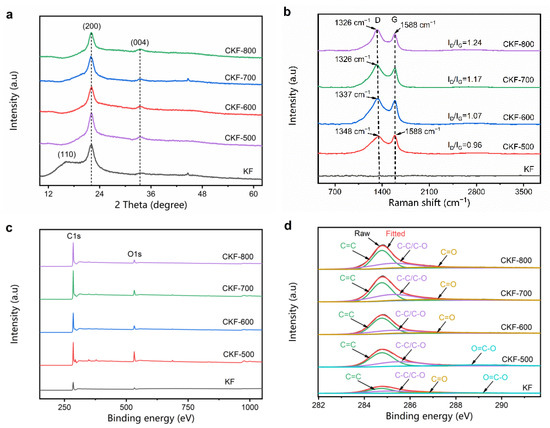 The crystallographic structure of the KF and CKF was characterized by XRD and Raman. As depicted in Figure 2a, KF presents a broad diffraction peak around 16.27°, which is assigned to amorphous cellulose and lignin [31]. After pyrolysis, two broad diffraction peaks at 21.95° and 33.46° corresponding to the (200) and (004) planes of the carbon phase can be observed for all CKF samples, indicating the formation of graphitic carbon. Moreover, gradually decreased strength of these characteristic peaks with the increasing of temperature indicates the increasing amount of amorphous carbon. Figure 2b shows the Raman spectra of KF and CKF obtained at different pyrolysis temperatures. While KF exhibits a flat curve with some slight fluctuations, all CKF samples demonstrate two characteristic peaks corresponding to the D band at −1326 cm−1 and the G band at −1588 cm−1, which stemmed from the lattice defects in the carbon atoms and the in-plane stretching vibration of sp2 carbon atoms of CKF, respectively [32]. Based on the phenomenological three-stage model proposed by Ferrari and Robertson, the absence of D-band and G-band characteristic peaks indicates the formation of nanocrystalline graphite. Generally, the ordering of carbon atoms or the degree of graphitization can be deduced from the intensity ratio of the D-band and G-band (ID/IG), and the higher the value of ID/IG means more defects. With carbonization temperature increases, the ID/IG value of CKF increases from 0.96 for CKF-500 to 1.07 for CKF-600, 1.17 for CKF-700, and 1.24 for CKF-800, indicating more defects and higher disordering degree [32]. Such moderately increased defects should provide not only more heterogeneous interfaces to induce dipole polarization, but also more specific charge-hopping sites to attenuate electromagnetic energy [33]. Figure 2c,d show the XPS results for KF and its carbonized counterparts. It can be seen that the XPS spectra of CKFs, similar to KF, show a significant increase in C/O atomic ratio upon increased temperature when it is compared with that of KF, implying the formation of the carbon phase. Moreover, the high-resolution C1s XPS spectra (Figure 2d) depict the strong suppression of oxygen-containing groups, including C−O (285.43 eV), C=O (286.58 eV), and O = C−O (288.53 eV), which further support the transformation of CKF [32].