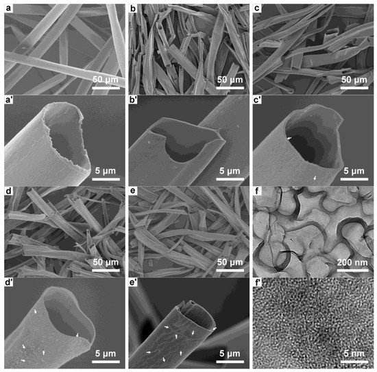 The morphologies of KF and CKF under different carbonization temperatures are visualized by SEM and TEM. It can be seen from Figure 3a,a′ that KF presents a cylindrical open-ended structure with wall thicknesses of 0.45–1.26 μm and external diameters of 8.28–21.78 μm, indicating hollow volume ratios ranging from 48.93–91.91%. After pyrolysis (Figure 3b–e), all CKFs maintain their round microtubular structure with microscale channels that are much shorter than the wavelength of penetrated microwaves, which favors the reflection and scattering of electromagnetic waves [34]. When the carbonization temperature increases from 700 °C to 800 °C, there are more and more nanopores with the size of 50~500 nm in the wall (marked with white arrows in Figure 3c′–e′), which can be further verified by the TEM results in Figure 3f. Under the higher resolution (Figure 3f′), extensive sub-nanopores are noticeably observed, which together with nanopores and microtube form the hierarchical structures of CKF.