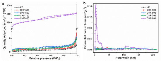 (a) Nitrogen adsorption–desorption isotherms and (b) corresponding pore size distributions of KF and CKF fabricated under different carbonization temperatures.
