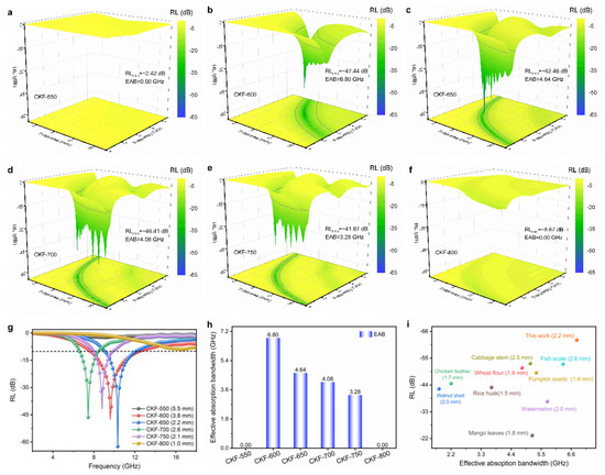 (a–f) Three-dimensional depictions of RL plots for CKF-based absorbers with different thicknesses and frequency; (g) RL curves and (h) effective absorption bandwidth of CKF at the optional thickness; (i) comparison of the MA capacity of reported biomass-derived carbon.