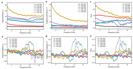 Frequency-dependent electromagnetic parameters for CKF: (a) real part (ε′) and (b) imaginary part (ε″) of complex permittivity, (c) dielectric loss (tan δε), (a′) the real part (μ′) and (b′) imaginary part (μ″) of complex permeability, and (c′) magnetic loss (tan δμ).