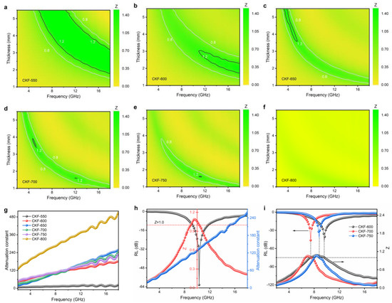 (a–f) Contour maps of Z values for CKF-based absorbers as a function of thickness and frequency; (g) calculated attenuation constant of prepared CKF samples; (h) the relationship between RL, attenuation constant, and Z for CKF-650; (i) frequency-dependent RL and Z for CKF-600, CKF 700, and CKF-750.