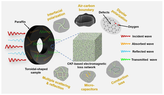 As aforementioned, it can be rationally concluded that the superior microwave absorbing performance of the CKF-derived carbon microtube can stem from its hierarchical structure with nanopores, mesopores, and microtube, which affords CKF balanced impedance matching and microwave dissipation capacity. Figure 8 schematically illustrates the hierarchical-structure-associated microwave attenuation of CKF. Initially, the combination of regular microtube and interconnected carbon skeleton with numerous nanopores affords CKF improved impedance matching, allowing incident electromagnetic waves of broad frequency to penetrate the CKF-based absorber and generate multiple scattering or/and reflections. Then, the pyrolysis-induced hollow carbon skeleton endows numerous conductive pathways for electron transport and hopping, generating strong conduction loss. Moreover, interior nanopores along the carbon microtube generate numerous capacitor-like structures and solid–void interfaces, boosting the attenuation of the penetrated electromagnetic wave. Last but not the least, carbon defects and residual oxygen atoms in microtube skeletons could reinforce the dielectric loss via dipolar polarization.