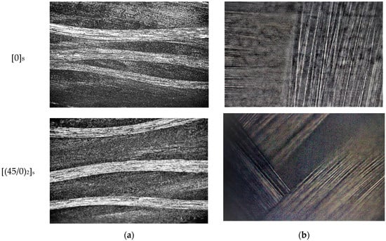 The dimensions of the plates were 295 × 205 mm2 with different thicknesses d. The rule of mixture [44] states that the elastic modulus depends on the volume content of fibres Vf. For the stacking sequences [0]8 the volume content value is 0.47 ± 0.003; for [(45/0)2]s it is 0.46 ± 0.003, as determined according to the recommendations of ASTM D2584 [45].
