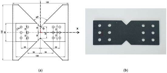 The geometry of the specimens was optimized to perform tests to determine the properties of laminates that are subjected to large deformations and the distribution of stress concentrations in the central area. The Iosipescu shear test [47] works well for isotropic materials, while the development of the method for orthotropic materials, particularly composites, is still being studied [48]. Test specimens were made from the 4 plates (using the Iosipescu test specimen model) with flat geometry, each having two symmetrical V-notches (butterfly sample) [47]. The specimen model was used for pure shear and is standardized for different metals, including composites, as shown Figure 3.