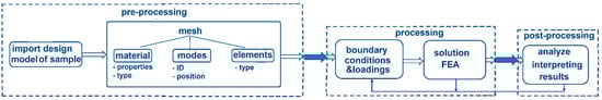 FEA was performed using a 3D graphic model designed in SolidWorks 2021 and imported into Ansys 2021 R1. In FEA, the fixing of the specimen in AD followed the modelling of the maximum stress distribution in the significant narrow section of the sample, the dependence of the fabric structure on the axis of the applied load, and the influence of the radius of the tip of the notch on the stress concentration. FEA simulations were performed for each type of sample stacking, [0]8 and [(45/0)2]s, with the direction of the fibers being an important parameter. The steps using ANSYS software FEM analysis are shown in Figure 4.