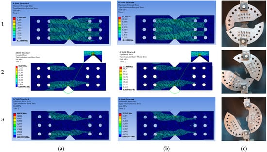 FEA for modified specimen with tip curvature radius 2.54 mm obtained AT in tension (1), compound stress in tension with shear α = 45° (2) and shear (3): (a) stacking sequence [0]8; (b) stacking sequence [(45/0)2]s; (c) failed specimens.