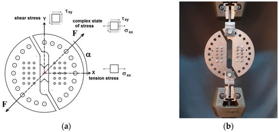 CFRP butterfly samples were made for AD testing to loadings for shearing, traction, or shearing with traction (with different ratios between σ and τ) in the weakened section by changing the angle of force application α, Figure 6.