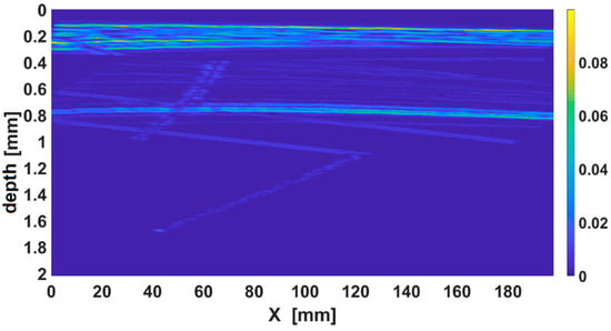 The degree of porosity was determined by the US method, using Phasor XS coupled with a phased array with 32 sensors with a pitch of 0.5 mm, a central frequency 5 MHz, and a delay line and is presented in Figure 7. The degree of porosity is linearly correlated with attenuation and with the mechanical properties, i.e. shear resistance. A lower percentage of 3–5% was detected, which is still acceptable [52,53].