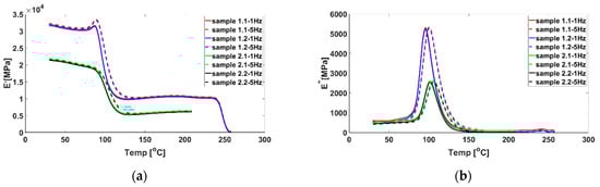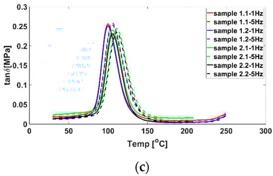 The DMA analysis of the CFRP plates made in the two stacking modes shows that the changes in the dynamic mode of the materials under the vibration load with temperature do not differ significantly. The loss modulus reflects the adhesion of the material. The storage modulus, i.e., the modulus of elasticity reflects the stiffness of the material. The ratio between the loss and storage modules is the damping of the material tan δ. δ is the phase angle of stress and strain. The maximum value of tan δ is close to the glass transition temperature of CFRPs. The graph shows that the storage modulus (E′) increases slightly with increasing frequency at low temperatures, as seen in Figure 8. It is observed that the strength of the material is satisfactory up to about 97 °C for both types of stacking, after which it decreases in the interval [90–150 °C]. Under the conditions in this interval, the secondary hardening of CFRPs takes place as a result of the reaction between the functional groups of the resins.