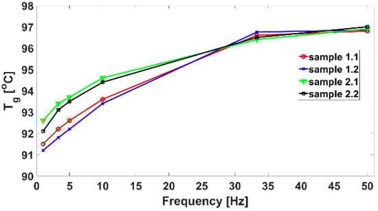From dynamic test modes with CFRPs, it is observed that with the increase of the vibration frequency, there is an increase in Tg by one degree for the stacking sequence of [(45/0)2)]s compared to [0]8, as seen in Figure 9. The phenomenon is normal, and is related to the viscoelastic behaviour of the resin. Fibre orientation appears to reduce the range of variation of Tg from 5.3 °C for [0]8 to 4.9 °C for [(45/0)2)]s and therefore increases Tg as the upper critical safe-design limit.