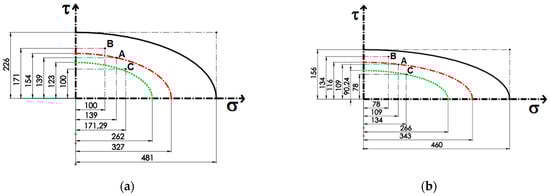 The failure envelope of material is designed through a curve fitting procedure, as some points of the envelope have been determined experimentally. The failure envelope, once traced, can be used for any further combinations of normal stress and shear stress, which is useful in the designing of components. This proves that the fracture’s envelope depends on different physical properties and mechanisms. The safe zone will now be considered as the one inside the small ellipse, and the Tsai–Hill criterion can be easily rewritten for each composite material studied in this work. The obtained results show that the failure criteria taken into consideration are correct and can be used for the prediction of failure in the analyzed composite structures.