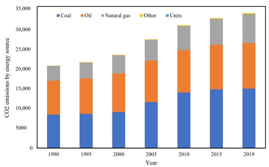 As part of the net-zero emissions project, many countries aim to reduce greenhouse gas emissions by law. Because of the increasing population and number of industries, the emission of greenhouse gases such as CO2 is on the rise. Figure 1 demonstrates CO2 emissions from the most popular fuel sources since 1990. Globally growing CO2 emissions are a critical issue to be addressed in the near future. Net-zero projects suggest that CO2 emissions should be equal to the CO2 reduction processes or that clean energies should be used instead of carbon-based fuels [,].