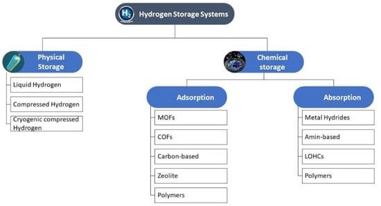 In contrast to PS, material-based or chemical storage (CS) relies on materials that can reversibly store hydrogen either as hydride or molecular hydrogen [,]. CS is predicted to have a higher hydrogen storage capacity at room temperature and lower pressures as well as a slower hydrogen release rate. There are two classes of chemical storage system, and each class has some subgroups based on the storage mechanism of absorption or adsorption (Figure 2). Metal hydrides such as LiBH4 or NaBH4 [,,,], amine-based materials [], and liquid organic carriers (LOHs) [,] store hydrides through the absorption mechanism. In such systems, hydrogen is able to be absorbed and released repeatedly by using hydrolysis, ammonolysis, or thermolysis methods. On the other hand, the hydrogen carriers based on the adsorption mechanism are metal–organic frameworks (MOFs) [], covalent organic frameworks (COFs) [,], and carbon-based carriers [,,]. There are advantages and disadvantages to each family; however, the most important drawbacks are related to hydrogen capacity, hydrogenation/dehydrogenation kinetics, hydrogen purity, process conditions, and overall cost, since the recovery of hydrogen from these materials mostly involves energy-inefficient endothermic processes [,].