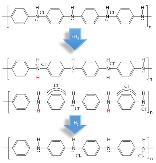 Intrinsically conductive polymers are a class of exciting organic materials that conduct electricity due to the presence of a metal atom in the center of the chains or because of unpaired electrons or π-electrons at each sp2 hybridized carbon atom. These polymers, which are sometimes termed synthetic metals, can be doped to exhibit electrical conductivity close to that of metals. Over the last three decades, the potential of ICPs has been investigated in various applications. Despite the electronic applications which are well known for these polymers, some ICPs have been proposed for coatings, skin tissue engineering, wound care, biosensors, and energy and gas storage [,,,]. Among ICPs for hydrogen storage systems, polyaniline (PANI), polypyrrole, and polythiophene have been investigated due to their excellent thermal, electrical, and environmental properties. The high hydrogen absorption capacity is not only related to the high porosity of crosslinked systems, but it can be enhanced by increasing the number of conductive groups which interact with the hydrogen atoms (Figure 3) []. Polyaniline, with the highest thermal stability and acid/base reactivity, exhibited a hydrogen sorption capacity of 6 and 8 wt% at ambient temperature and 8 bar, as reported by Cho et al. []. Besides the fact that these results were not generally corroborated by other studies on the H2 uptake of polyaniline, the gravimetric hydrogen capacity was also significantly decreased in the second and third cycles of hydrogen absorption [].