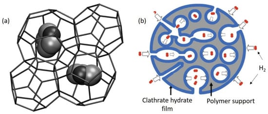 There have been some articles reporting the preparation of clathrate hydrates and semi-clathrate hydrates on the surface of various polymers to provide gas storage systems (Figure 5b) [,]. Su et al. reported a supported hydrogel for the storage of H2 and compared it to a simple clathrate. The polymer hydrogels result in a faster and more efficient formation of hydrogen clathrates, suggesting faster gas storage kinetics in clathrate-based technologies []. Over the past two decades, a few reviews summarized articles dealing with this subject [,,]. However, this field is still in development and will require careful studies of appropriate materials and conditions.