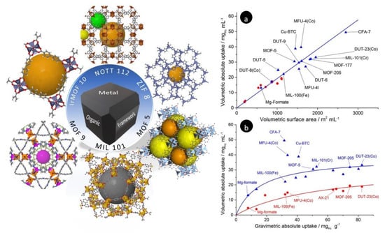 (Left) Schematic representation of some MOFs with high gas storage properties (copyright https://www.chemtube3d.com) (accessed on 14 April 2022); (a) linear relation between the volumetric hydrogen uptake at 77 K and 2.0–2.5 MPa and the volumetric surface area; (b) volumetric vs. gravimetric hydrogen uptake of various MOFs at 77 K and 2.0–2.5 MPa. The volumetric uptake was calculated using packing density (red) and single-crystal density (blue) [].