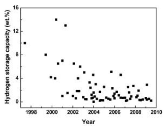 Plot of the hydrogen storage capacities of CNTs reported in the literature versus their year of publication (copyright Elsevier 2010) [].