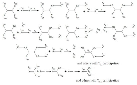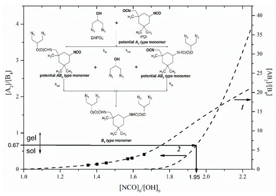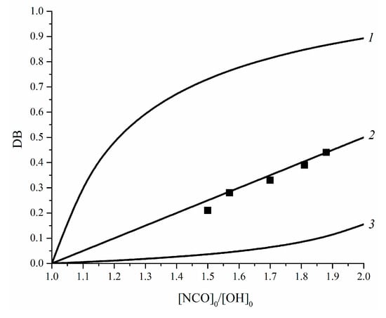 3.1. Influence of [NCO]0/[OH]0 Ratio on the Composition of AB2 + A2 + B4 Monomer Mixture and Structural-Kinetic Model of Their Polyaddition