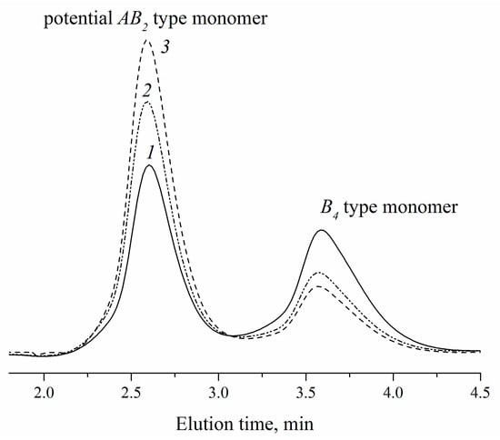 - Chen, H.; Kong, J.; Tian, W.; Fan, X.-D. Intramolecular Cyclization in A2 + B3 Polymers via Step-Wise Polymerization Resulting in a Highly Branched Topology: Quantitative Determination of Cycles by Combined NMR and SEC Analytics. Macromolecules 2012, 45, 6185–6195. [Google Scholar] [CrossRef]