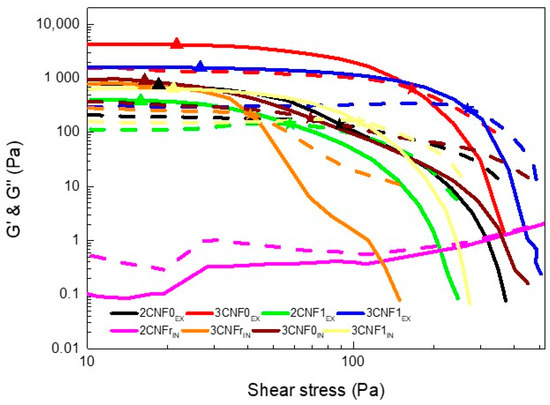 - Moberg, T.; Sahlin, K.; Yao, K.; Geng, S.; Westman, G.; Zhou, Q.; Oksman, K.; Rigdahl, M. Rheological properties of nanocellulose suspensions: Effects of fibril/particle dimensions and surface characteristics. Cellulose 2017, 24, 2499–2510. [Google Scholar] [CrossRef]