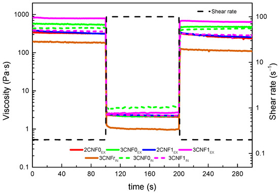 | Sample | η at 0.2 s−1 (Pa·s) | η at 100 s−1 (Pa·s) | n | ||