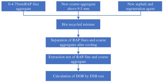 To avoid the unfavorable situation that the residual cohesion of RAP fines is too large to form a large-size particle cluster, which cannot effectively distinguish RAP and new aggregates, 4.75 mm is used as the dividing sieve. The RAP fines with particle size below 4.75 mm are selected for the old aggregate, and the new coarse aggregate with a particle size above 9.5 mm is selected for the new aggregate. This prevents the residual cohesive force of RAP fine particles from being too large to form false aggregates with large particle sizes, thus the unfavorable conditions that RAP fine particles and new aggregates cannot be effectively separated are avoided. The DOB test scheme is shown in Figure 2. RAP heating time is 2 h, new asphalt heating temperature is 165 °C, the new aggregate heating temperature is 180 °C, and stirring time is 3 min.