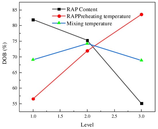 The DOB is calculated and analyzed according to the DSR test results, and the table of DOB test results is then obtained (see Table 5). The DOB results are statistically analyzed, and the average values and the range table of DOB under various hot recycling conditions are then obtained (see Table 6). The trend diagram of DOB results, as shown in Figure 2, is obtained according to factors and levels in Table 6.