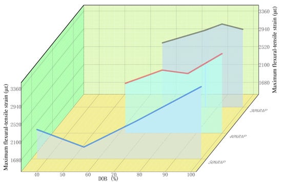 According to the test results in Table 7, the variation of maximum flexural-tensile strain and flexural-tensile strength of recycled mixture with the variation of DOB under different RAP contents are plotted, as shown in Figure 4 and Figure 5.