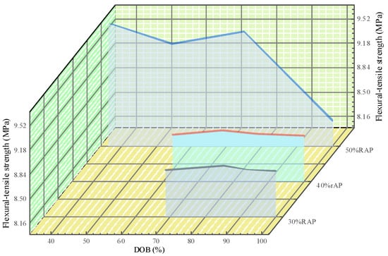 Variation of flexural–tensile strength with the variation of DOB under different RAP contents.