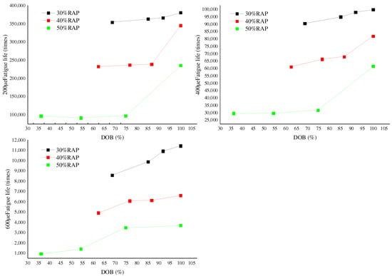 For the recycled asphalt mixture produced under preset mixing process parameters, the four-point bending fatigue test was carried out by using the UTM-25 servo-hydraulic multifunctional material test system. The test results are shown in Table 8. The strain modes are 200, 400, and 600 με, respectively. According to the test results in Table 8, the changes in fatigue life of recycled mixture with DOB under different RAP contents are plotted, as shown in Figure 6.
