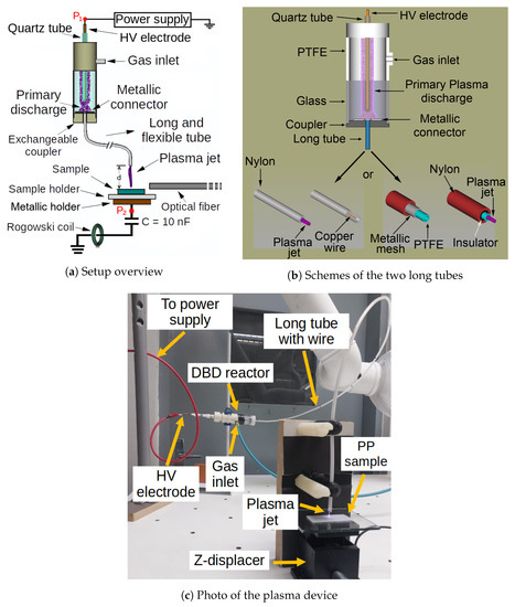 (a) Overview of the experimental setup. (b) Details of the two long tube configurations. (c) Photograph of the plasma device using the wire configuration, with the APPJ being applied on a PP sample.