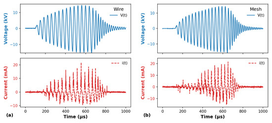Typical waveforms of applied voltage (V(t)) and discharge current (i(t)) using (a) wire and (b) mesh configurations. The gas flow rate was 2.0 L/min in both cases.