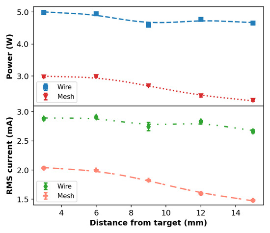 Figure 4 shows the behavior of and as a function of the distance (d) between the plasma outlet and the target using Ar at a flow rate of 2.0 L/min. From Figure 4, it can be seen that, for the wire or mesh configurations, both and curves present very similar trends as a function of d; however, they have different amplitudes. The average values are ~40% higher in the wire configuration when compared to the mesh one. In general, the values are ~35% higher when the wire is employed.