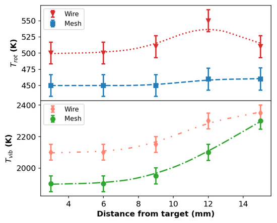 Rotational and vibrational temperatures as a function of the distance from target for both wire and mesh configurations with the APPJ impinging a glass target. The Ar flow rate was 2.0 L/min.