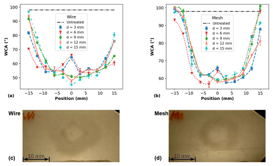 WCA profiles on PP surfaces measured for different distances between plasma outlet and target for (a) wire and (b) mesh configurations and corresponding photos of PP samples treated with (c) wire and (d) mesh when d = 6.0 mm.