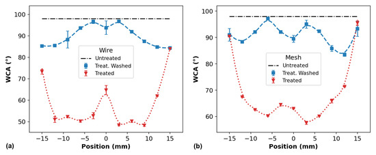 Comparison between WCA profiles of treated PP samples before and after washing for the APPJ treatment performed with (a) wire and (b) mesh mountings. The distance between plasma outlet and target was 6 mm.