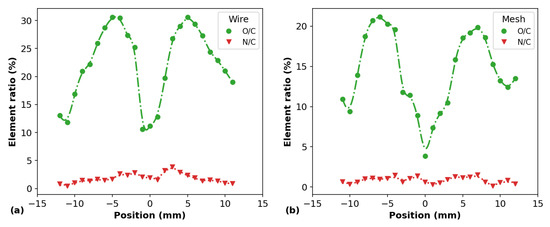 O/C and N/C element ratios obtained from XPS measurements on the surface of PP samples for different positions obtained for (a) the wire mounting and (b) the mesh one.